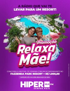 05 – No Sorteio final, será realizado uma live onde será sorteado 01 (um) final de semana com acompanhante para o FAZZENDA PARK HOTEL, em GASPAR – SC, onde possui uma diária para casal, objeto da promoção, mais R$1.000,00 em dinheiro, que será entregue no ato do sorteio. A Data para utilização da diária será de 30 de agosto de 2025 a 31 de agosto de 2025. Como a data está agendada, qualquer mudança ou alteração de data por parte do ganhador, necessitará que seja realizado pelo próprio ganhador, ficando sob responsabilidade do ganhador qualquer custo para o mesmo. Caso queira mudar de quarto, inserir mais pessoas, ou qualquer outra alteração, todo este custo é único e exclusivo do ganhador, não ficando sob responsabilidade da Rádio HIPER 93.9 FM ou de qualquer patrocinador.